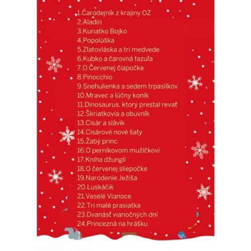 - Otvorte každý večer jedno okienko a prečítajte si knižku spolu s deťmi. Predstavte si, akú radosť budú mať vaše deti, keď každý deň objavia v adventnom kalendári namiesto čokoládky jednu rozprávkovú knižku. Presne to na vás čaká v adventnom kalendári plnom kníh. Sú to príbehy klasické, či už z tradičných ľudových rozprávaní, alebo od svetovo preslávených autorov, ako boli Andersen alebo Grimmovia. Dopĺňa ich niekoľko vianočných básní. Textom vdýchli život rôzni ilustrátori, a tak sa môžete tešiť na vskutku pestrú paletu príbehov. Vo vašej rodine sa tak zrodí úplne nová, kúzelná predvianočná tradícia.