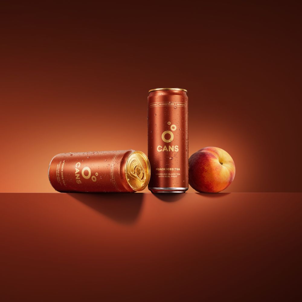 CANS Peach Iced Tea. Sýtený ochutený nápoj, s výluhom z čierneho čaju a s príchuťou broskyne