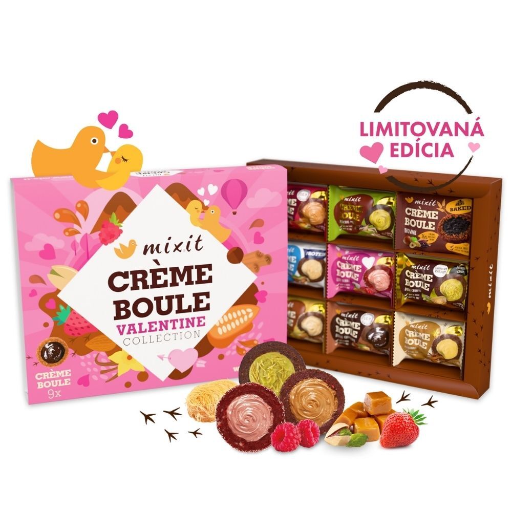 Čau, láska, vitaj, Bouleniéra! Vo vnútri luxusnej valentínskej krabičky sme ukryli deväť Creme boulí – guľôčok z datlového cesta naplnených rôznymi zamatovými krémami. Tie sme vytvorili z prémiových ingrediencií, ako je pravá vanilka, mrazom sušené jahody, pistácie alebo Single Origin kakao z Peru. Nechýba ani zamilovaná boule Love Berry s lyofilizovanými malinami, kokosom a afrodiziakálnou guaranou. Všetky Mixit Creme boule sú bez palmového oleja a zbytočných umelých prísad, pretože veríme, že skutočná chuť, rovnako ako láska, nepotrebuje kompromisy. Skvelý darček, ale aj príležitosť na degustáciu šiestich príchutí Creme boulí alebo ako alternatíva k nudnej bonboniére. Čo nájdete vo vnútri? 4x Creme boule Love Berry 1x Creme boule Pistachio Mio 1x Creme boule Strawberry Caramel 1x Creme boule Double Chocolate 1x Creme boule Vanilla Date 1x Creme boule Coconut Heaven A prečo našu Bouleniéru vyskúšať? Creme boule sú bez palmového oleja a používame len prémiové suroviny ako sú mrazom sušené jahody, pravá vanilka, pistácie alebo single origin kakao z Peru. V Bouleniére nájdete hneď 9 delikátnych Creme boulí a ochutnáte tak celú našu ponuku týchto ďatlových dobrôt. Vrátane bestsellerov, sezónnych limitiek aj horúcich noviniek. Bouleniéra je skvelý darček, ktorým zaručene urobíte radosť každému maškrtníkovi.