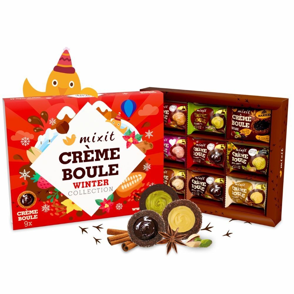 Zbohom, bonboniéra, vitaj, Bouleniéra! Vo vnútri luxusnej krabičky sme ukryli deväť Creme boulí, guličiek z datľového cesta so zamatovými krémami. Tie sme vytvorili z prémiových ingrediencií, ako sú pravá vanilka, mrazom sušené jahody, pistácie alebo Single Origin kakao z Peru. Nechýbajú ani tri typicky zimné boule s vôňou škorice, klinčekov a badiánu. Všetky Mixit Creme boule sú bez palmového oleja a zbytočných umelých prísad, pretože veríme, že pravá chuť nepotrebuje kompromisy. Skvelý darček, ale aj príležitosť na degustáciu siedmich príchutí Creme boulí. Creme boule sú bez palmového oleja a používame len prémiové suroviny ako sú mrazom sušené jahody, pravá vanilka, pistácie alebo single origin kakao z Peru. V Bouleniére nájdete hneď 9 delikátnych Creme boulí a ochutnáte tak celú našu ponuku týchto ďatlových dobrôt. Bouleniéra je skvelý darček, ktorým zaručene urobíte radosť každému maškrtníkovi.