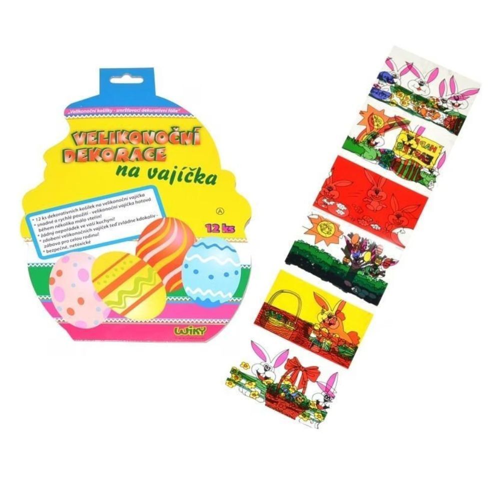 Veľkonočná dekorácia na vajíčka Návod: Na vychladnuté varené vajíčko navlečte košieľku, potom položte na lyžicu a ponorte na 3 sekundy do vriacej vody. Košieľka sa okamžite obopne okolo vajíčka. Výrobok je zdravotne nezávadný. Nevhodné pre deti - nebezpečenstvo obarenia pri práci. Košieľky na vajíčka s motívom zajačikov 12ks v balení. Ľahko a rýchlo ozdobené vajíčka!