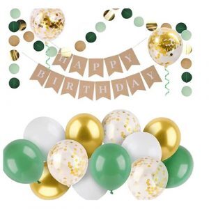 - 3 ks zelený balón, 3 ks biely balón, 3 ks zlatý balón, 3 ks priesvitný balón so zlatými papierovými konfetami, nápis "Happy Birthday" v papierovej forme prírodnej farby, farebné ladené krúžka na šnúrke, papierová zlatá stuha