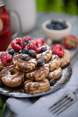 7. Pečiete, až kým nie je cesto zlatohnedé. Hotové dolky môžete posypať čerstvým ovocím, poliať javorovým sirupom alebo polevou z čokolády.