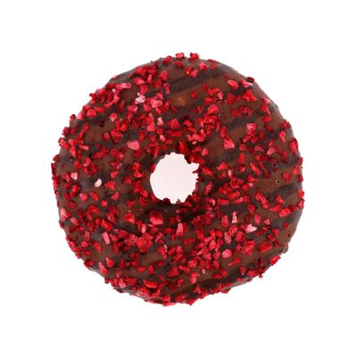 Jemné pečivo s malinovou náplňou (18,9%), čokoládovou polevou (11,4%), hnedými prúžkami (3,7%) a lyofilizovanými malinami (1,6%), rozmrazený polotovar.