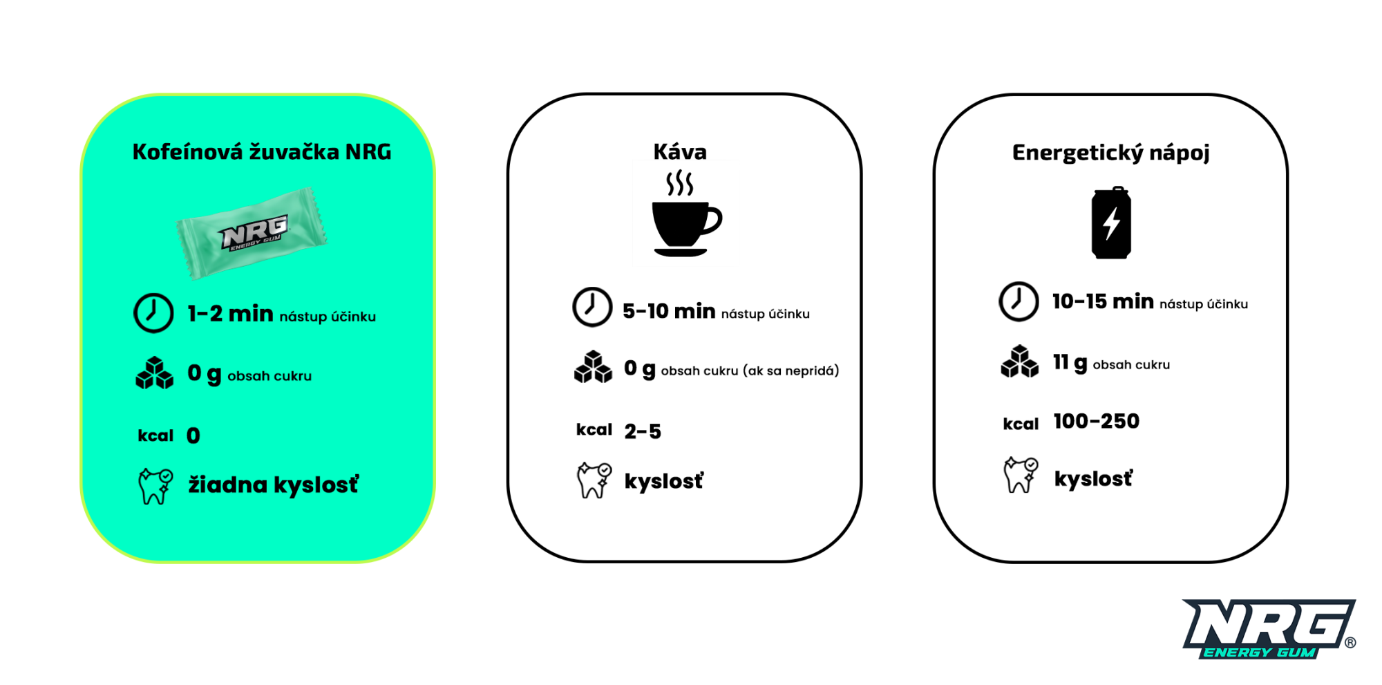 NRG Energy Gum patrí medzi prvé kofeínové žuvačky svojho druhu dostupné na slovenskom trhu. Vďaka tekutému vnútru sa kofeín uvoľňuje priamo pri žuvaní a do krvného obehu sa dostáva už v priebehu minúty.