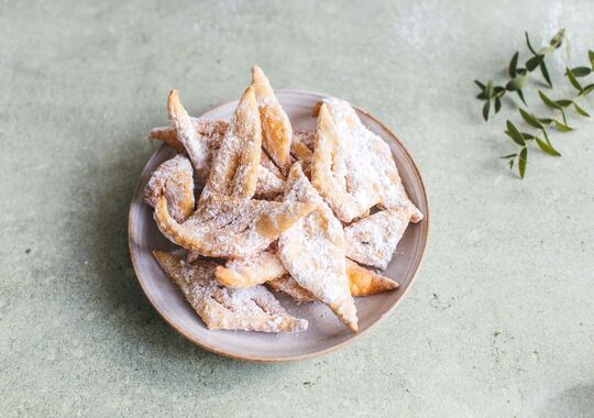 Všetky suroviny spolu zmiešajte vo väčšej mise a ručne domieste na jemne pomúčenej pracovnej doske. Cesto by malo byť hladké a nelepivé. Zakryte ho utierkou a nechajte cca 30 minút odpočinúť pri izbovej teplote. Do užšieho a vyššieho hrnca dajte olej a pomaly ho zahrievajte, kým nedosiahne teplotu cca 175 stupňov. Trvá to približne 15 - 20 minút. Olej je potrebné zahrievať pomaly a postupne. Cesto rozvaľkajte na približne 2 mm hrúbku a pomocou radielka nakrájajte najprv diagonálne z jednej strany a potom z druhej na pásy široké cca 3-4 cm. Vzniknú vám kosoštvorce, ktoré ešte v strede 2 až 3 x nakrojte, tak aby okraje zostali celé. Takto pripravené fánky postupne vysmážajte do zlata z každej strany. Usmažené fánky nechajte odkvapkať na papierovej utierke a ešte teplé obaľte v cukre. Ideálne je ich jesť čerstvé.