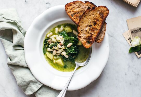 Potom polievku odstavte zo sporáku, pridajte pesto, zamiešajte a môžete podávať. Ideálne ešte dochuťte trochou soli (slanina aj pesto sú slané, preto najprv ochutnajte), čerstvo mletým korením a keď si dáte polievku na tanier na vrch nastrúhajte ešte parmezán. A podávajte s hriankou z kváskového chleba opečenou na olivovom oleji, a posypané parmezánom.