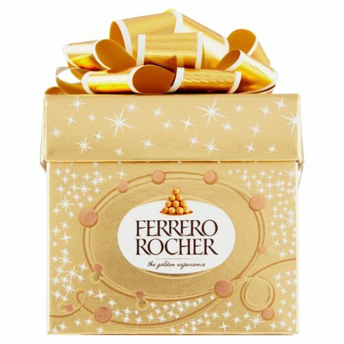 Ferrero Rocher Oblátky poliate mliečnou čokoládou s drvenými lieskovcami. Balené v darčekovej krabičke s mašľou, balenie obsahuje 6 ks praliniek.