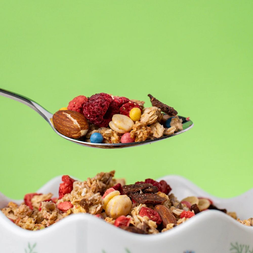 Zloženie výrobku: granola 71 % (celozrnné ovesné vločky, vláknina z kořene čekanky, slunečnicová semena, lněná semena, řepkový olej), kokosové plátky s kakaem 5 % (kokosové plátky pražené 67,8 %, třtinový cukr, kakaový prášek 7,5 %, mořská sůl), mandle pražené 4,7 %, směs barevných křupinek v bílé čokoládě 11,6 % [bílá čokoláda 69 % (cukr, kakaové máslo, sušené mléko, sušená smetana, emulgátor: lecitiny; přírodní vanilkové aroma), crispies (pšeničná mouka, cukr, jedlá sůl, kakao se sníženým obsahem tuku), prášek z mrazem sušených malin, mleté listy zeleného čaje, koncentrát spiruliny a světlice barvířské, lešticí směs (lešticí látka: arabská guma; cukr, med)], kukuřičné lupínky v bílé čokoládě 3,4 % [bílá čokoláda 56 % (cukr, kakaové máslo, sušené plnotučné mléko, sušená smetana, emulgátor: lecitiny; přírodní vanilkové aroma), kukuřičné lupínky 42 % (kukuřičná krupice, cukr, jedlá sůl, ječný sladový výtažek, minerální látka: uhličitan vápenatý), lešticí směs (lešticí látka: arabská guma; cukr, med)], lyofilizované jahody 2,1 %, lyofilizované maliny 1,7 %