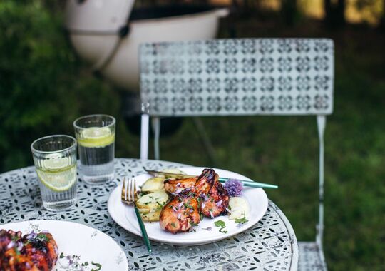 Ugrilované mäso pred podávaním posypte čerstvými bylinkami (napríklad petržlenová vňať, či pažitka, a tymian) a podávajte s obľúbenou prílohou.