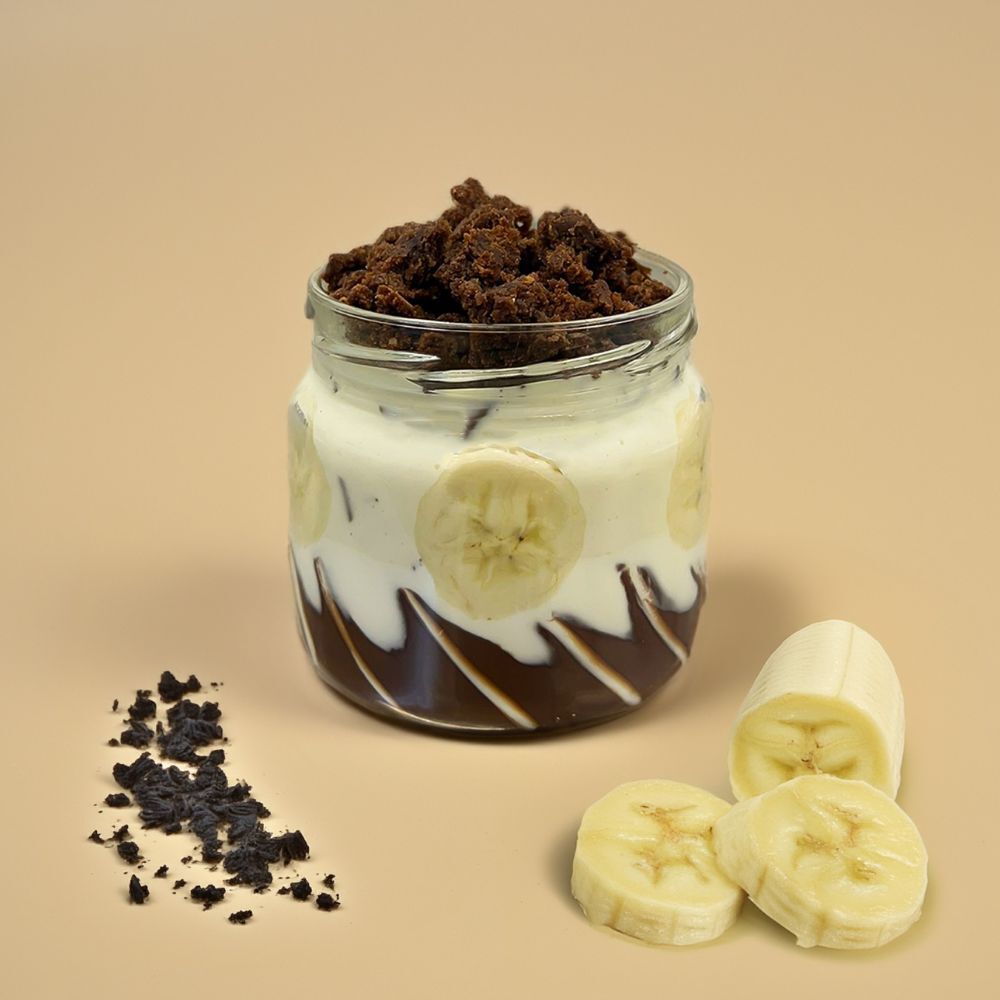 Zloženie výrobku: Smotanový jogurt 71 % (mlieko, smotana, jogurtová kultúra), banán, nugátový krém [cukor, nestužený rastlinný tuk (palmový, shea), sušená srvátka, kakaový prášok so zníženým obsahom tuku, emulgátor (sójový lecitín), aróma, vanilkový extrakt, pasta z lieskových orechov, jedlá soľ], hoblinky mliečne (cukor, kakaové maslo, sušené plnotučné mlieko, kakaová hmota, emulgátor (sójový lecitín), prírodný vanilkový extrakt), brownie pečivo [cukor, vajcia, palmový tuk, pšeničná múka, repkový olej, kakaová hmota, kakaové maslo, glukózový sirup, zvlhčujúca látka (glycerol), sušené plnotučné mlieko, kakaový prášok so zníženým obsahom tuku, sušené odtučnené mlieko, emulgátory (E492, sójové lecitíny, E476), sladené kondenzované odtučnené mlieko, sušená srvátka, mliečny tuk, škrob, jedlá soľ, konzervant (sorban draselný), regulátor kyslosti (kyselina citrónová), želírujúca látka (alginát sodný), kypriace látky (uhličitany sodné, difosforečnany), arómy], proteínový prášok (srvátkový koncentrát, emulgátor: sójový lecitín, aróma, sladidlo: sukralóza)