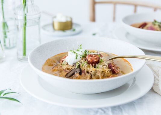 Kapustu zľahka prepláchnite vodou a nechajte jemne odkvapkať. Tento krok záleží aj od chuti kapusty, ktorú je vždy najprv lepšie ochutnať, ak nie je príliš kyslá, tento krok vynechajte. Ku kapuste pridajte sušené huby, údené mäso a zalejte vodou cca 5 cm pod okraj hrnca. Všetko musí byť ponorové. Pridajte bobkový list, korenie a štipku soli. Varte na miernom ohni približne hodinu, kým sa údené mäso neuvarí do mäkka. Potom pridajte na kolieska nakrájanú klobásu a na kocky nakrájané bravčové mäso a varte ďalších približne 30 minút, kým bravčové mäso nezmäkne. Ak je výsledná kapustnica príliš svetlá pridajte ešte trochu mletej papriky, ale záleží to od použitej klobásky. A máte hotovo. Stačí, ak údené mäso vyberiete, nakrájate na menšie kúsky a môžete rovno podávať. Kapustnica chutí lepšie na druhý deň, a potom na tretí a na štvrtý, ak z nej zostane.