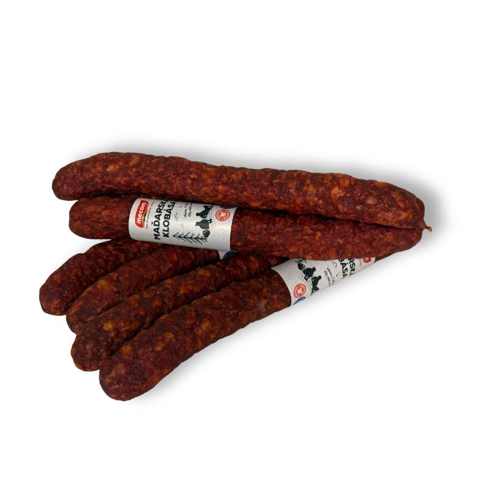 Zloženie výrobku: bravčové mäso, bravčový tuk, jedlá soľ, koreniny, živočíšna bielkovina bravčová, dextróza, sušená zelenina (cesnak), farbivo (extrakt papriky), antioxidant (kyselina askorbová), extrakty korenín, štartovacia kultúra, konzervačná látka (dusitan sodný), plnené do jedlého bravčového čreva. Na 100g hotového výrobku bolo použité 111g mäsa.