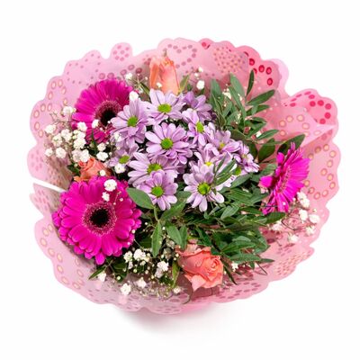 Curel Kytica čerstvých kvetov Valentín, kytica obsahuje Gerbery, Ruže, Chryzantémy, Gypsomilku a dekoračnú zeleň.