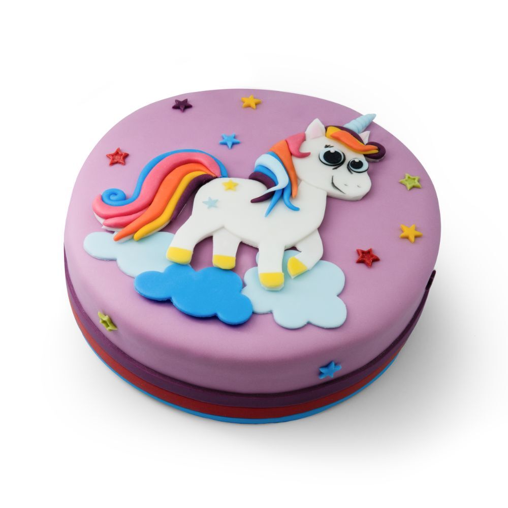 Zdobená medová torta MARLENKA® 1100 g – Jednorožec. Vrstvená medová torta s karamelovým krémom, potiahnutý a zdobený fondánom (30%). Cukrársky výrobok s náplňou ľahkú tukovú (38%).