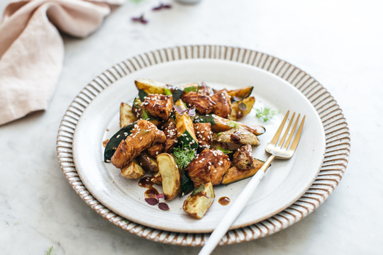 Mäso jemne osoľte, pridajte ázijskú omáčku a 1 PL olej a nechajte chvíľu marinovať. Ale pokojne aj cez noc. Zemiaky umyte, nakrájajte na štvrťky, osoľte a dobre premiešajte so zvyšným olejom. Dajte piecť do vyhriatej rúry na 200 stupňov na približne 20 – 25 minút, kým nebudú upečené do zlata. V liatinovom hrnci či panvici sprudka orestujte mäso. Ak je marináda príliš tekutá, na začiatok dajte len mäso, marinádu pridajte až neskôr. Restujte len zopár minút aby sa mäso zbytočne nevysušilo, potom pridajte cuketu, restujte ďalšiu minútku dve a nakoniec pridajte aj marinádu a restujte ešte chvíľu. Na tanier dajte zemiaky, kúsky mäsa so zeleninou, polejte omáčkou, posypte semiačkami a pridajte čerstvé bylinky.