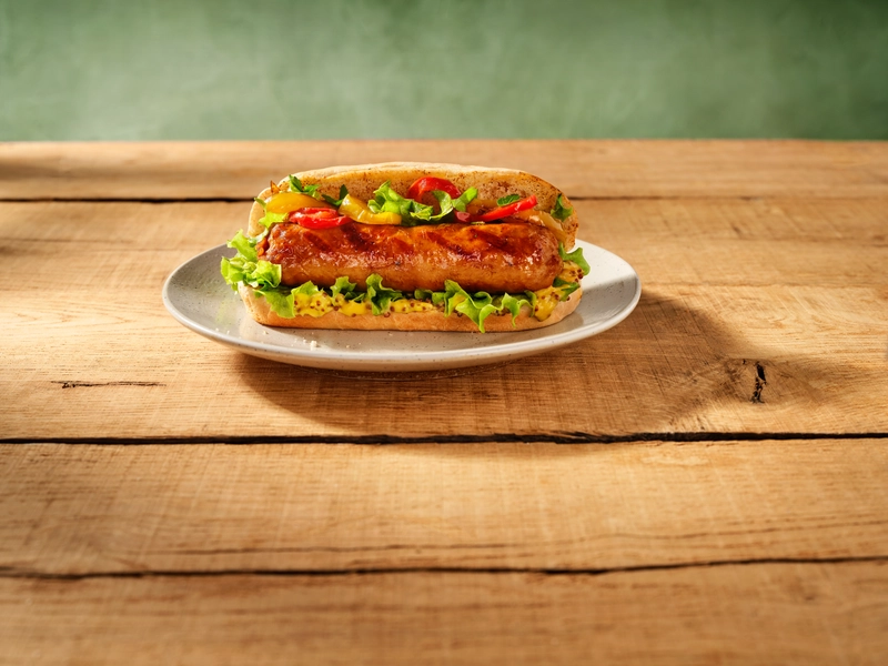 Zloženie výrobku: Voda, hrachový proteín* (16 %), repkový olej, aróma, ryžový proteín, konzervačná látka (laktát draselný), kokosový olej, inulín, ocot, stabilizátory (metylcelulóza, chlorid vápenatý, konjaková guma, xanthanová guma), extrakt z kvasníc, zemiakový škrob, koreniny, bylinky, ovocný koncentrát (granátové jablko), zeleninové koncentráty (červená repa, mrkva), jablčný extrakt, psyllium vláknina, dymová aróma, cibuľový prášok, soľ, draselná soľ, gélotvorná látka (alginát sodný).