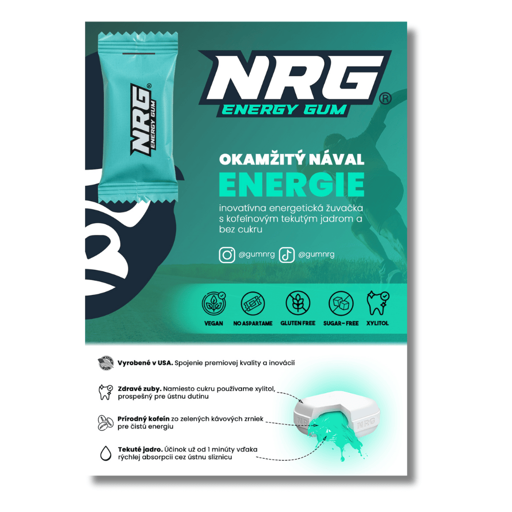 Okamžitý nával ENERGIE. Inovatívna energetická žuvačka s kofeínovým tekutým jadrom a bez cukru.