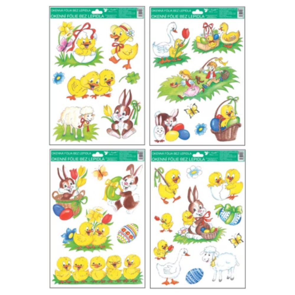 Okenná fólia tradičné veľkonočné motívy Naše okenné fólie neobsahujú lepidlo. Na plochu priľnú elektrostaticky a nezanechávajú tak po sebe žiadnu stopu. Vhodné sú akékoľvek hladké plochy, napríklad sklo, výklady, zrkadlá alebo kachličky. Čisté – bez lepidla – opakovane použiteľné Použitie: 1.Odporúčame pred použitím plochu očistiť od prachu a iných nečistôt. 2.Fólia sa ľahko aplikuje sňatím z podkladového papiera a umiestením na hladkú plochu. 3.Fóliu priložte a vyhľaďte prípadné bublinky rukou alebo suchou handričkou. 4.Po použití je možné ich uložiť na pôvodný podkladový papier a uskladniť na ďalšiu sezónu. Produkty sa nachádzajú v rôznych motívoch. Zasielame náhodne podľa skladovej dostupnosti.