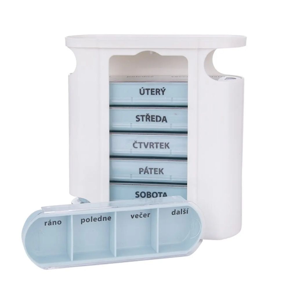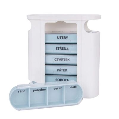 Pokiaľ je vaším každodenným úskalím nezabudnúť si vzít své léky, kupte si je na krabičku pouze tuto. Najdete v nej celkom sedem modrých priehradok, z nichž každá je rozdělena do čtyř samostatných sekcií – ráno, poludnie, večer a další. Můžete si pripraviť týždeň predpísanú dávku liekov na celý týždeň. Jednotlivé poschodia majú označení podľa dní v týdnu a mají vlastně zatváracie sviečku. Potrebnú priehradku si tak můžete vzít kamkoľvek so sebou a nebát se toho, že léky vytratíte. Aktuální den je vždy nahoře. Keď dané poschodie vyprázdnite, vsuňte ho dole boxu, nechť máte připraveny na zítra. Celá krabička je vyrobena z kvalitního plastu. Vrchol priehradok je průhledný, díky čemu máte přehled o jejich obsahu. Je vyrobený z plastu PP.
