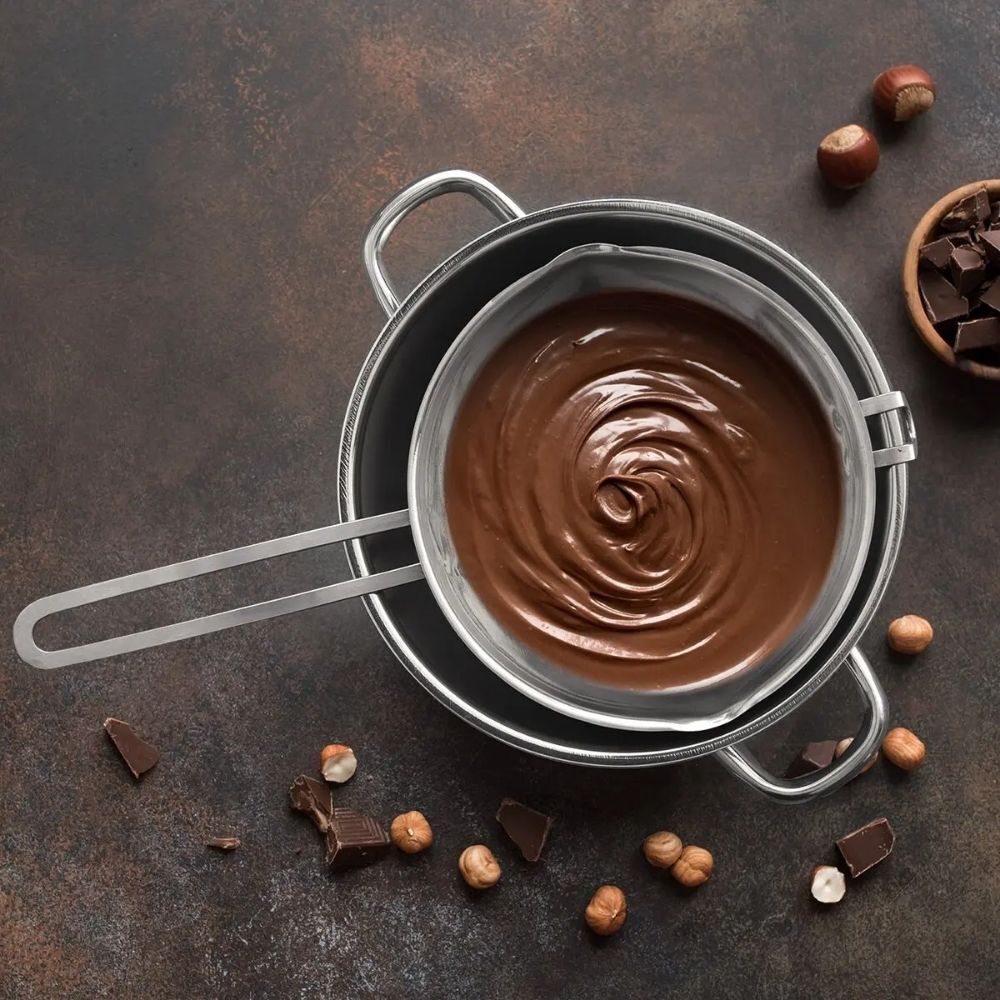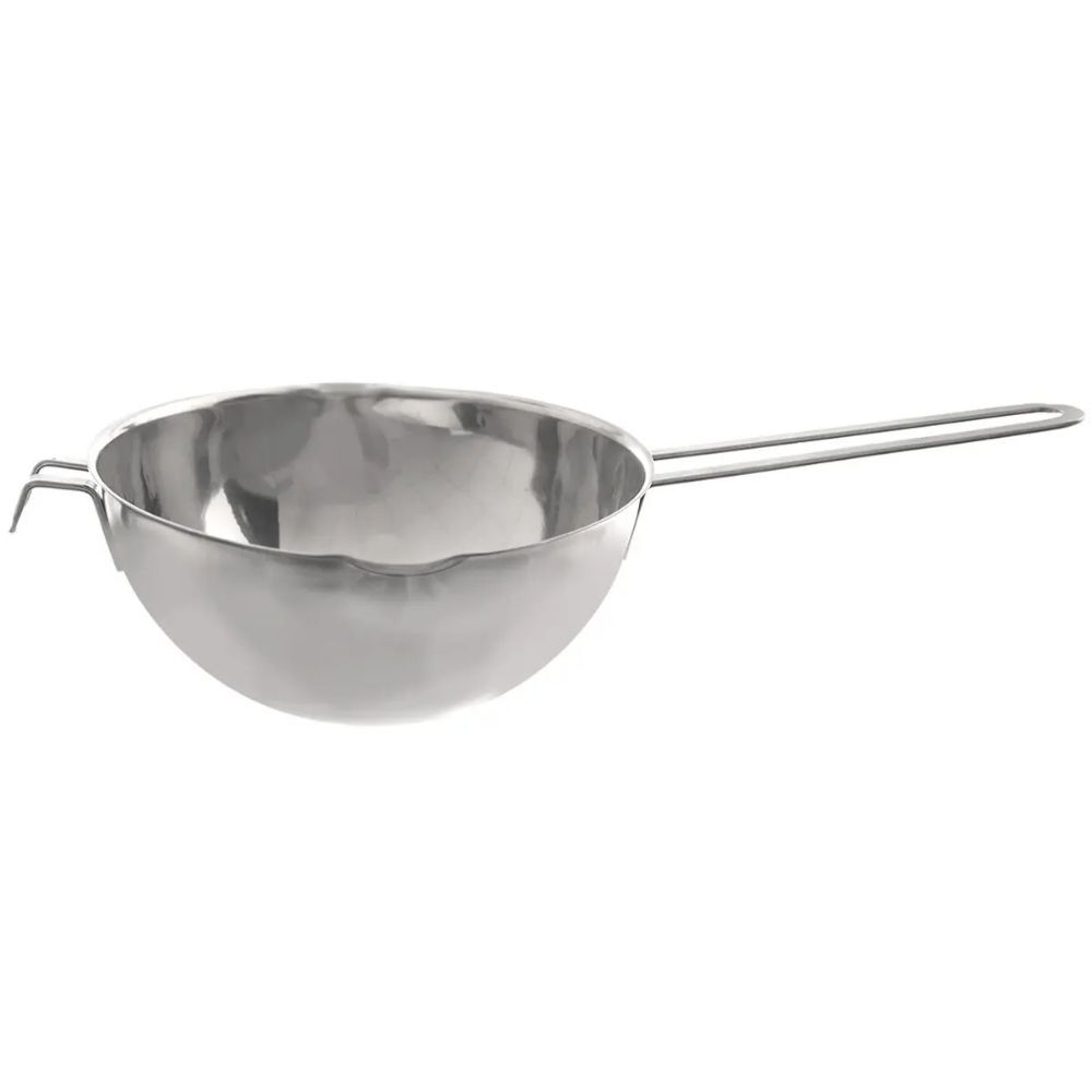 Táto nerezová miska uľahčí rozpúšťanie masla, čokolády a vybraných poliev vo vodnom kúpeli. Výborne poslúži vďaka svojej veľkosti aj pri príprave krémov alebo na prípravu holandskej či béarnskej omáčky. Má dlhšiu rukoväť a praktické uško, vďaka ktorým ju pohodlne a bezpečne umiestnite na hrniec s vodou. Výhodou sú aj dve výlevky pre ľahšiu manipuláciu s obsahom misky. Vnútorný priemer nádoby je 17,5 cm, vonkajší 18 cm. Je možné ju umývať v umývačke aj zavesiť, celková dĺžka je 35 cm a hĺbka 8 cm.