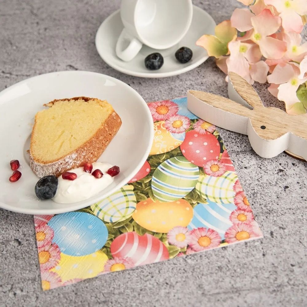 Tú pravú bodku pri prestretom stole dodá veľkonočne ladený papierový obrúsok. Či už si dáte prácu a zložíte ho, alebo ho jednoducho položíte pod pripravené príbory. Aj misa s originálnymi farebnými kraslicami bude ešte krajšia, keď ich podložíte obrúskom s veľkonočným motívom. Táto sada 20 kusov trojvrstvových obrúskov podčiarkne slávnostné stolovanie nielen na Veľkú noc, ale využijete ich po celé jarné obdobie.
