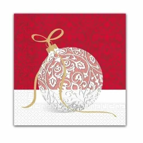 Papierové servítky-obrúsky 3 vrstvové s potlačou, vzor: Vianočná guľa s mašľou, rozmer: 33 x 33 cm, materiál: papier, farebné prevedenie: červeno-biele . Balenie obsahuje: 20ks. Produkt sa predáva len na celé balenie.
