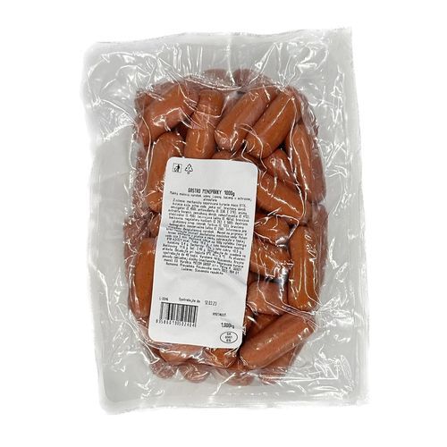 mechanicky separované kuracie mäso 61%, kuracie kože, pitná voda, jedlá soľ, hrachový škrob, emulgátor (E 450), antioxidanty (E 330, E 316), arómy, extrakty korenín, zemiakový škrob, zahusťovadlo (E 412), stabilizátor (E 466), želírujúca látka (E 407a), bravčová bielkovina, regulátory kyslosti (E 262, E 500), dextróza, glukózový sirup, cesnak, farbivo (E 120), bravčový hemoglobín, konzervačná látka (E 250). Informácia pre alergikov: Bezgluténový výrobok.