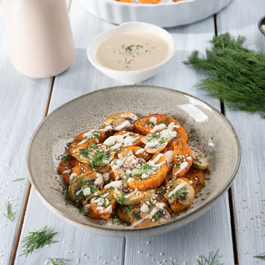 Upečené batáty podávame so šampiňónmi, tahini dresingom a extra pokrájaným kôprom. Ozdobiť môžeme sezamovými semienkami.