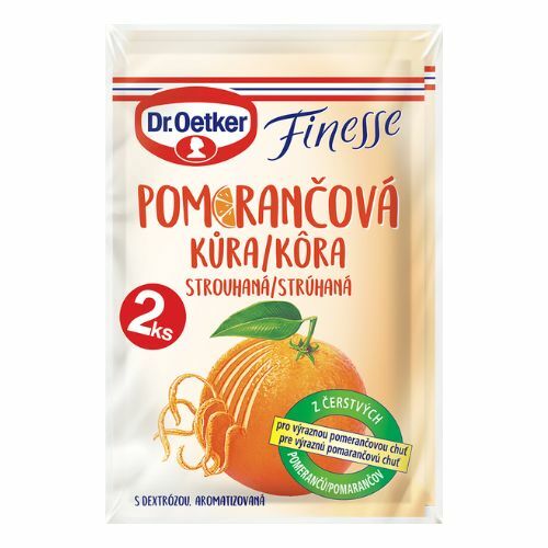 Dr. Oetker Finesse Pomarančová kôra strúhaná s dextrózou, stabilizovaná, na zjemnenie tort, koláčov, sušienok, náplní, dezertov a poliev. Hmotnosť / Objem balenia: : 2x6g (0,012kg).