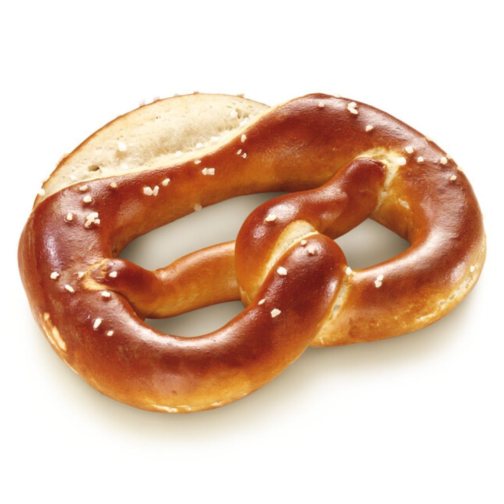 Dopečený praclík z lúhovaného cesta s maslom, prerezaný.