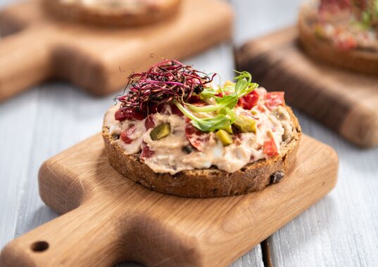 Maslo vyberieme z chladničky a necháme pri izbovej teplote zmäknúť. Vajcia umiestnime do vody a uvaríme ich na trvdo. Od zovretia varíme 8 minút. Po uvarení ich ocedíme, zalejeme studenou vodou a necháme vychladnúť. Po vychladnutí vajíčka očistíme, rozrežeme, vyberieme žĺtka. Bielka pokrájame na malé kocky. V mixéri rozmixujeme očistené sardinky, zmäknuté maslo, žĺtka, horčicu, kečup a pokrájanú cibuľu. Uhorku a kápiu pokrájame na drobné kocky. Rybaciu nátierku premiestnime do misky a zmiešame s pokrájanou uhorkou, kápiou a bielkami, dochutíme soľou. Chlebíčky s natretou nátierkou ozdobíme cviklovými a hrachovými klíčkami.