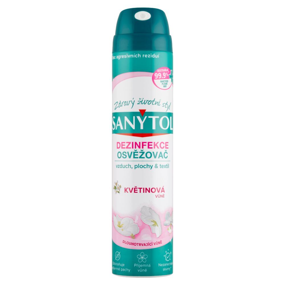 Sanytol, expert na dezinfekciu bez chlóru, vyvinul dezinfekčný osviežovač pre perfektnú hygienu domova a príjemný pocit sviežosti. Jeho jedinečné zloženie neutralizuje pachy a zabíja 99,9% mikroorganizmov vo vzduchu, na povrchu aj textíliách. Zápach neprekrýva, ale odstraňuje jeho príčiny. Ideálny na: Čistenie vzduchu vo veľmi navštevovaných alebo v málo vetraných miestach: tabakové pachy, zatuchlina, pachy v kuchyni, na toaletách, v skrini, v aute,... Na dezinfekciu povrchov: koberce, závesy, matrace, vankúše, autosedačky, kľučky, počítače, telefóny, nádoby na odpadky, vypínače, záchodové misy, ... Odporučenie - ako prevencia alebo v období epidémie (chrípka, gastroenteritída, ...) Trojitý účinok: baktericídny podľa normy 13697 (5min), fungicídny podľa normy EN 13697 (15min) a virucídny podľa normy EN 14476 (30min). Účinnosť bola overená a skontrolovaná v akreditovanom laboratóriu. Odstraňuje okrem iného: Adenovirus typu 5, Poliovirus typu 1, Staphylococcus aureus, Escherichia coli, Trichophyton rubrum, Candida albicans, Aspergillus brasiliensis, Enterococcus hirae, Pseudomonas aeruginosa,...
