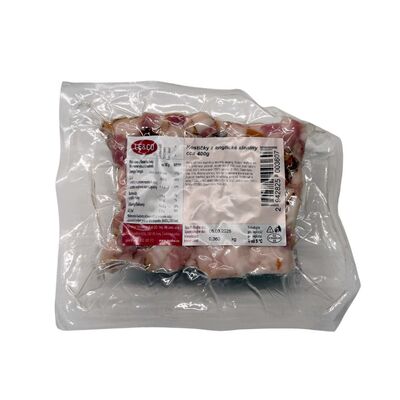 Bravčový bok 94%, pitná voda, jedlá soľ, konzervant (E 250), cukor, stabilizátory (E450, E451), antioxidant (E301), farbivo (E150d). Obsah tuku: max. 45%.