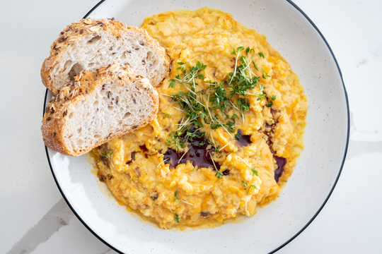 čerstvým pečivom, pažítkou či inými bylinkami a pokvapkaný tekvicovým