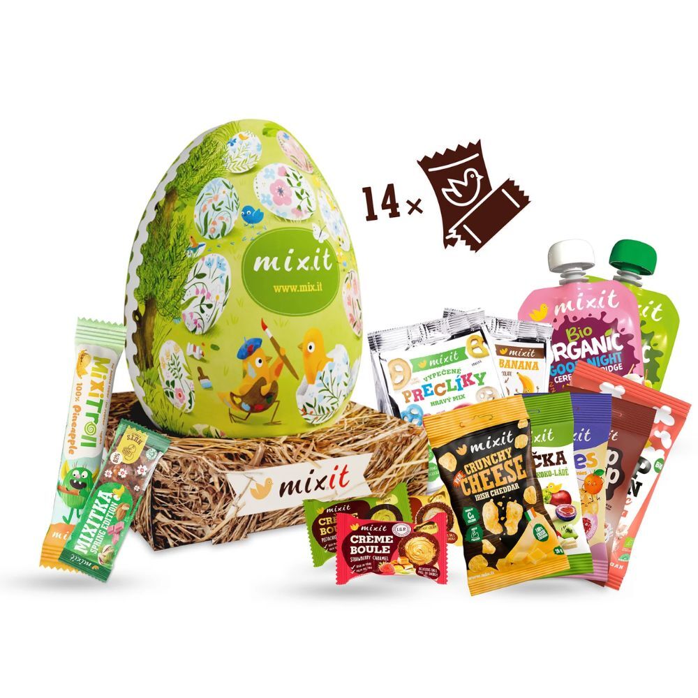Veľké veli-koko-nočné Mixit vajce v sebe ukrýva 14 Mixit dobrôt, ktoré potešia deti aj dospelých. Vo vnútri nájdete všetky tri obľúbené príchute Creme boulí, želé cukríky Mixies, kakaové Peep Peep a banániky v čokoláde do vrecka. Nechýbajú ani novinky posledného roka – ananásová MixiTrollka, dve ovocné kapsičky, bio jahodový popcorn či Chrumkavý írsky cheddar do vrecka. Z veli-koko-nočnej kolekcie sme pridali Mixitku, obľúbené Mixit vajíčka a hravé praclíky do vrecka. Vajce s veľkonočnými ilustráciami má aj hniezdo, do ktorého ho môžete umiestniť, a skvele poslúži ako dekorácia. Veli-koko-nočné vajce je perfektný veľkonočný darček. Môžete ho darovať celé, rozdeliť obsah medzi šibačov alebo dobroty poskrývať po byte či záhrade a premeniť hľadanie na napínavú hru! 14 dobrôt bez palmového oleja, bez umelých látok. Ručne vyrábané veľké vajce (25 cm) s hniezdom, ktoré poslúži ako dekorácia.