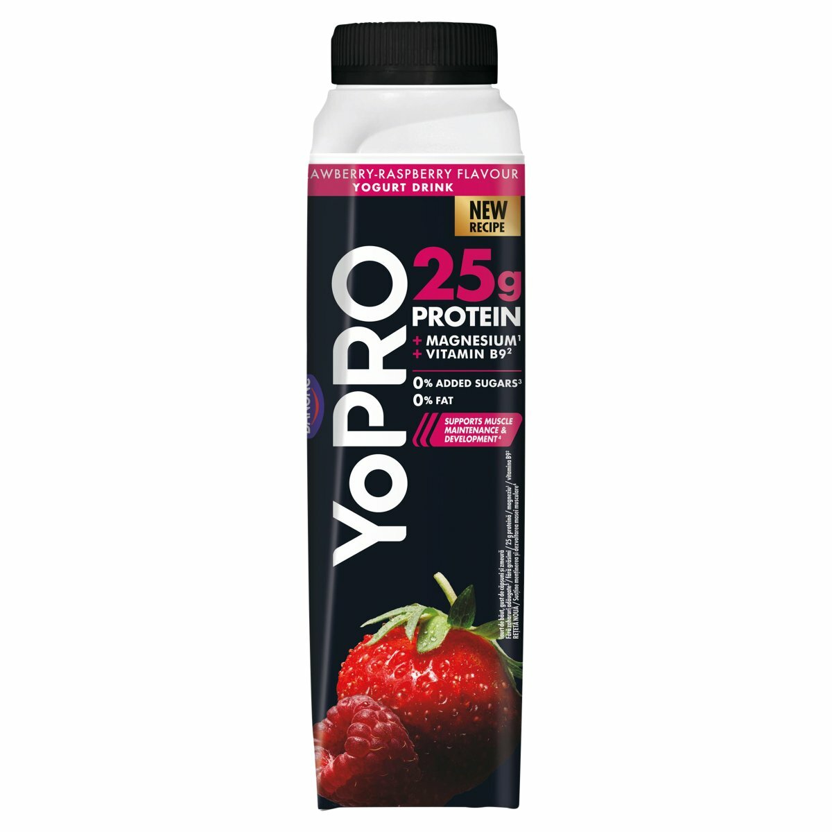 Zloženie výrobku: Odstredené mlieko, srvátková bielkovina, jahodové pyré z koncentrátu 0,75 %, modifikovaný škrob, malinové pyré z koncentrátu 0,25 %, regulátory kyslosti (kyselina citrónová, citran sodný), laktáza, arómy, zahusťovadlo (pektíny), jogurtové kultúry, sladidlá (acesulfám - K, sukralóza), horčík (dicitran horečnatý), kyselina listová. Alergény (zoznam zložiek): Mlieko Zoznam akejkoľvek zložky, technologickej pomocnej látky odvodenej z látky alebo výrobku, ktorá spôsobuje alergie: Môže obsahovať stopy gluténu (lepok