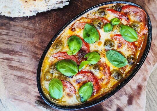 Nakrájame si na kolieska paradajky aj mozzarelu. Množstvo záleží od veľkosti zapekacej misy. Do zapekacej misy budeme po riadkoch ukladať kolieska paradajok a do ďalšieho riadku mozzarelu. A takto na striedačku biely a červený riadok. Posolíme a pokoreníme podľa chuti. Berte do úvahy, že olivy sú tiež slané, takže to netreba so soľou preháňať. Pokvapkáme olivovým olejom a vložíme do vyhriatej rúry na 220 – 230 stupňov pod gril (horný ohrev). Pečieme asi 20 minút. Po vytiahnutí z rúry doladíme lístkami čerstvej bazalky a môžeme podávať. Najlepšie sa k tomu hodí čerstvá chrumkavá bagetka.