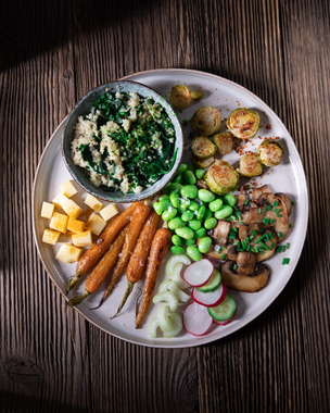 Celozrnný kuskus zalejeme vriacou vodu 1:2 a necháme napučať. V panvici roztopíme maslo, pridáme prelisovaný cesnak a hrsť špenátových listov, miešame približne 2 minúty a následne pridáme kuskus. Baby mrkvu a prepolený ružičkový kel umiestnime do zapekacej misky, pokvapkáme olivovým olejom a celé to spolu zamiešame, dáme piecť do vyhratej rúry na 200 stupňov približne 20 minút. Po 10 minútach zeleninu otočíme. Sójové bôby zalejeme vriacou vodu a po 2 minútach precedíme. Posypeme Maldon soľou. Šampiňóny nakrájame na plátky a osmahneme na masle z oboch strán. Leerdammer syr nakrájame na kocky, redkvičku a uhorku na kolieska a stopkový zeler na plátky. Všetky suroviny umiestnime na tanier a už len vidličku do ruky.