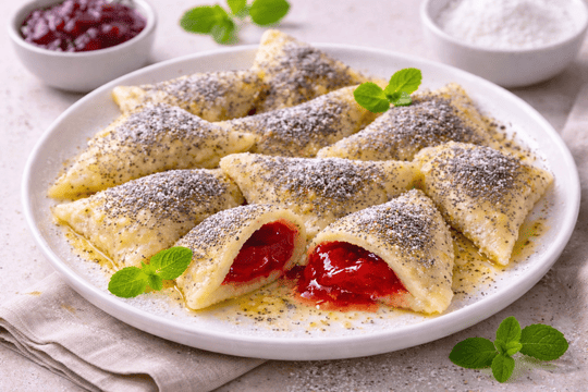 Zemiaky uvarte v šupke, nechajte čiastočne vychladnúť a olúpte. Zemiaky prelisujte spolu s tvarohom. Primiešajte múku, vajcia, soľ a vypracujte na cesto. Cesto vyvaľkajte na plát hrubý 5 mm a nakrájajte na štvorce veľké približne 6x6 cm. Do stredu štvorcov vložte lyžicu džemu, prehnite do trojuholníka a okraje dobre popritláčajte. Pirohy vložte do hrnca s vriacou osolenou vodou a varte približne 10 minút. Pirohy vyberte a nechajte odkvapkať. Pred podávaním pirohy posypte mletým makom, polejte maslom a poprášte práškovým cukrom.
