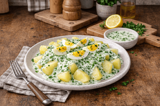 Zemiaky s vajcom a zelenou omáčkou