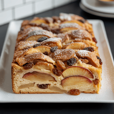 Sendvič nakrájajte na tenšie plátky a navlhčite mierne osoleným mliekom s rozšľahanými vajcami. Ošúpané, jadrovníkov zbavené jablká nakrájajte na tenšie plátky. Pekáč vymastite maslom a na dno rozložte tretinu plátkov navlhčeného sendviča. Na sendvič navrstvite polovicu na plátky nakrájaných jabĺk. Posypte polovicou umytých, sparených hrozienok a polovicou cukru zmiešaného so škoricou. Na jablká položte druhú tretinu navlhčených plátkov sendviča, ktorú pokryjete zvyškom jabĺk. Jablká posypete zvyškom hrozienok, zvyškom škoricového cukru a pokryte ich zvyškom sendviča. Žemľovku pokvapkajte tretinou roztopeného masla a v stredne rozohriatej rúre pečte dozlata.